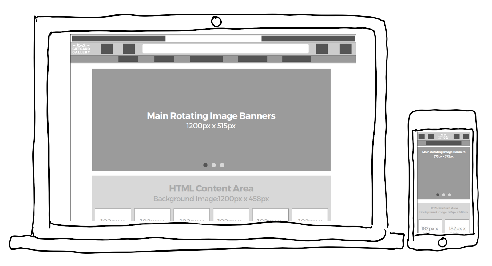 Wireframes of the homescreen showing image sizes and content types.
